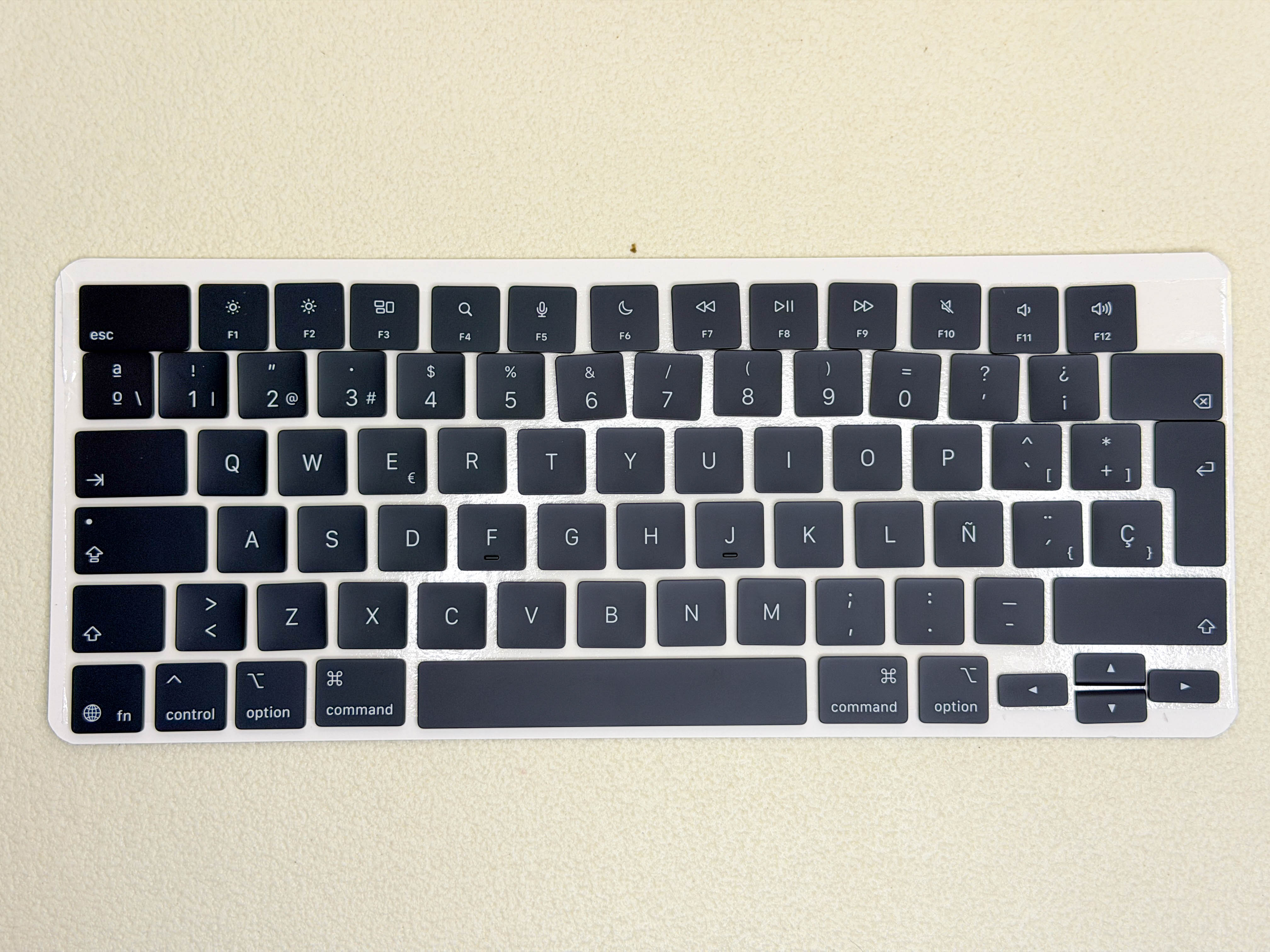 Komplekts izstrādāts speciāli spāņu ISO formātam ar lielu taustiņu Enter un papildu taustiņu pa kreisi no Shift, pilnībā saderīgs ar MacBook ar vācu vai franču izkārtojumu.
